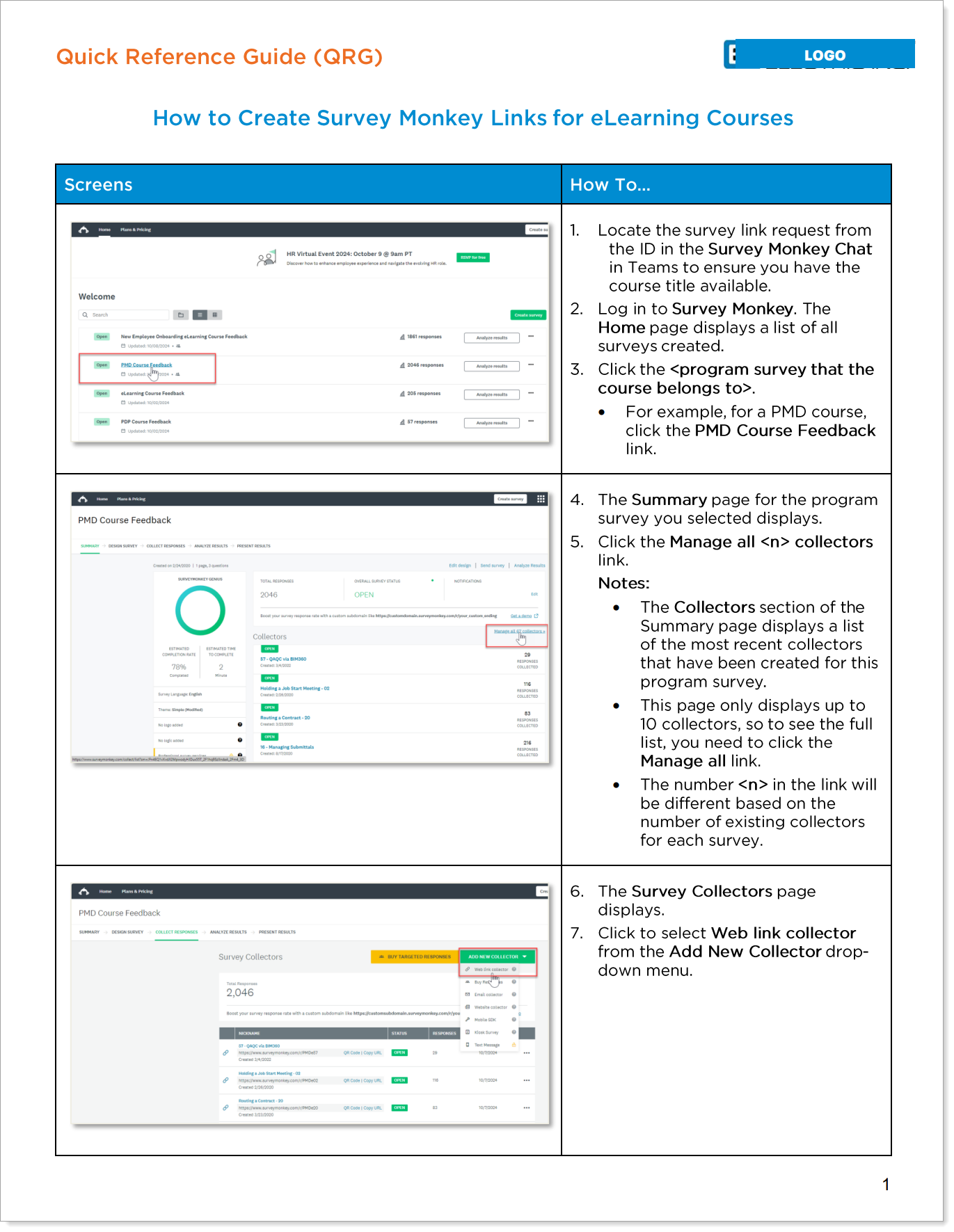 This is an excerpt of a quick reference guide I created to assist the L&D team of a national electrical engineering and construction company capture an internal process for creating training survey links in Survey Monkey in order to transition it to a resource in HR Shared Services.