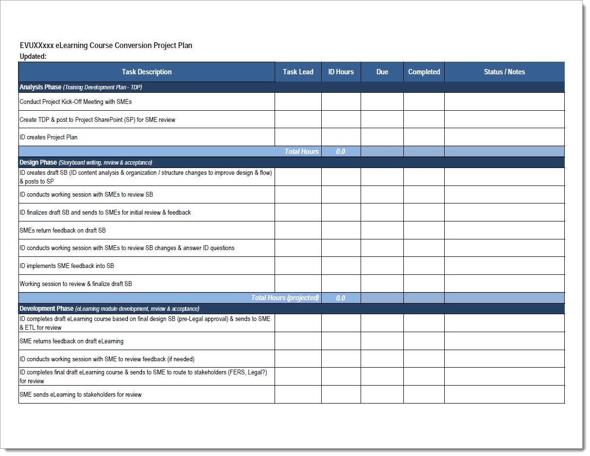 Design documents are an instructional designer's “bread and butter.” I have developed my own custom documents for every step of the end-to-end process for designing and developing training materials and programs.
