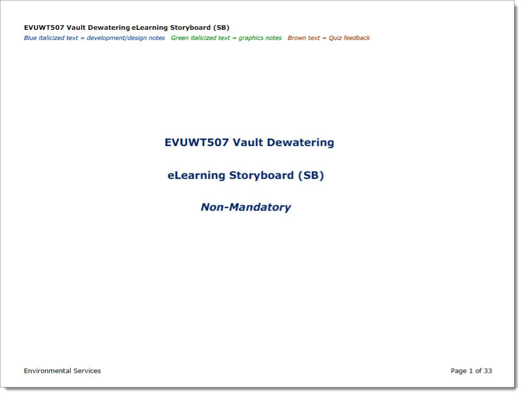 Description: I created this original storyboard template to facilitate the design of multiple eLearning compliance trainings in Articulate Studio for a gas and electric utility company.