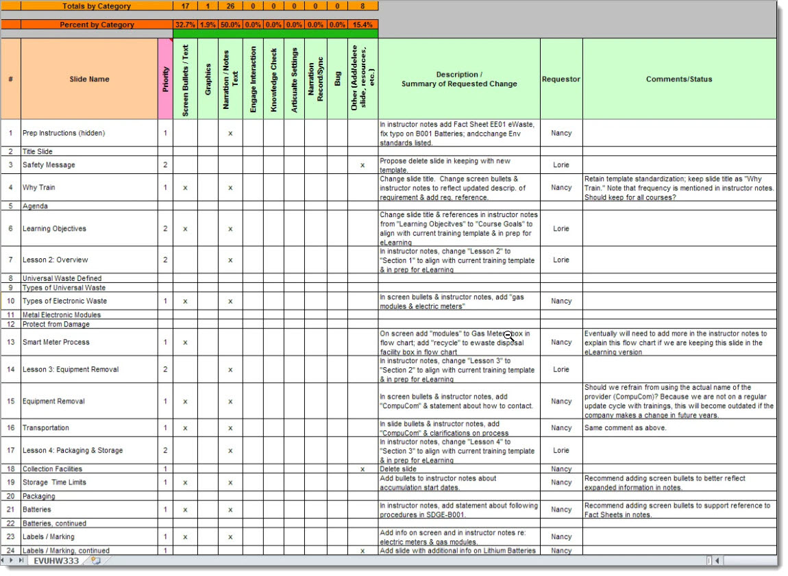 Description: I created this course review change log template in collaboration with colleagues to enable our team to track review changes for eLearning courses required after SME and stakeholder reviews.